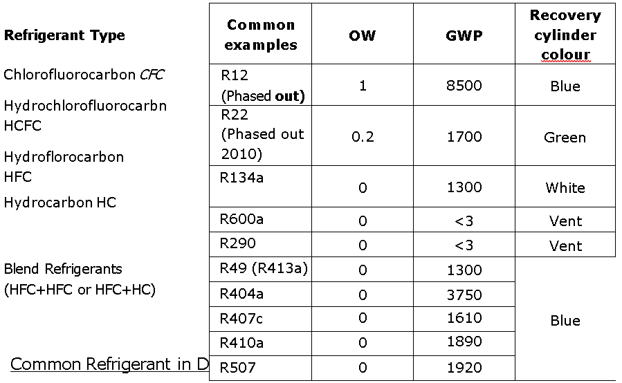 As you can see from the tables above all refrigerants have a global warming potential and/or an Ozone depleting potential, because of this no refrigerants except HC’s can be intentionally released to atmosphere.