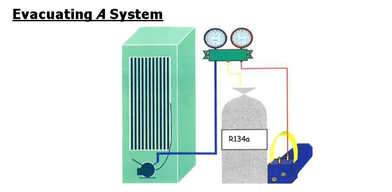 Refrigerant systems need to be evacuated to remove air and moisture after service work has been carried out. Moisture will only be removed if a full vacuum is held for a prolonged period of time (20 minutes). The pressure gauge should indicate 28″Hg and this reading should be held when the manifold is closed and the vacuum pump switched off. If the pressure reading rises then this would indicate that the system has a leak. Moisture held within the air left in a refrigerant circuit can effect performance and possibly form acids that will damage the system.